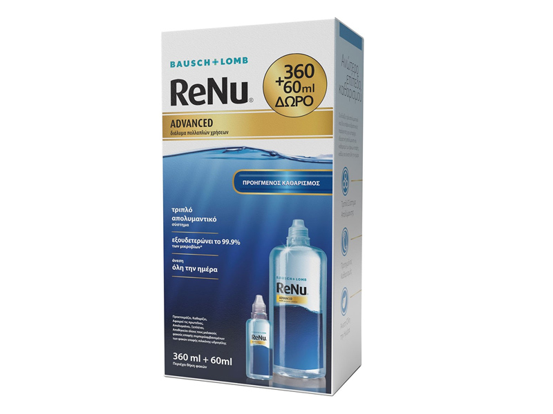 Το Bausch & Lomb ReNu ADVANCED συνδυάζει καινοτόμες τεχνολογίες για να προσφέρει εξαιρετική απολύμανση και καθαρισμό των φακών επαφής, εξασφαλίζοντας άνεση καθ’ όλη τη διάρκεια της ημέρας.