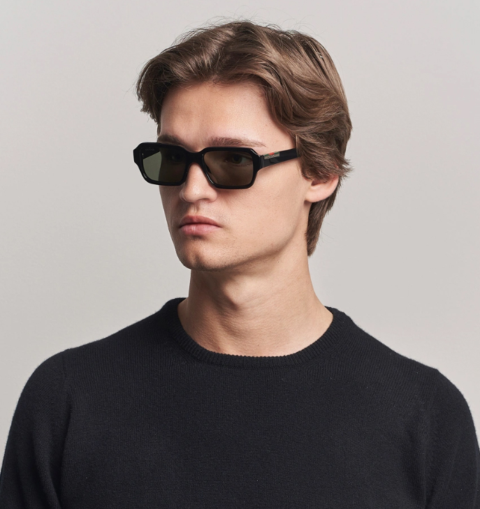- Σκελετός: Πλήρες πλαίσιο από μαύρο acetate — στιβαρό, με γυαλιστερό φινίρισμα, που προσθέτει μια ιδιαίτερα polished εμφάνιση.